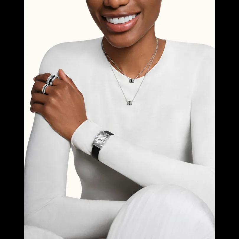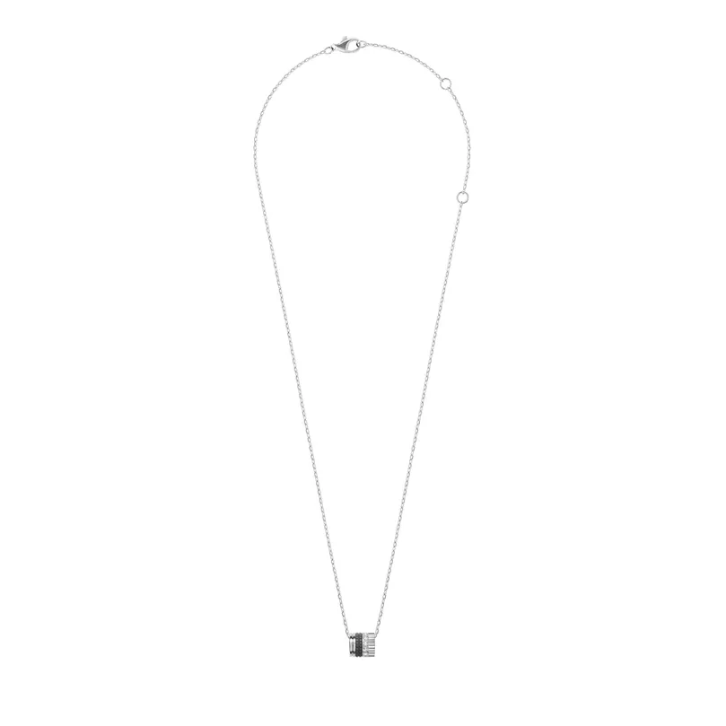 يظهر إبداع الدار بشكل رائع في هذه القلادة كاتر بلاك إيديشن - Quatre Black Edition المرصوفة بالماس. ويتباين الطلاء الأسود بتقنية PVD الذي يغطي رمز "كلو دو باري" بطبقة لامعة مع الذهب الأبيض المتألق في زخرفة الحرير المضلّع "غروغران" وزخرفة الأخاديد المزدوجة "دوبل غودرون". إبداع قوي يُبرز الأساليب الأكثر جرأة.