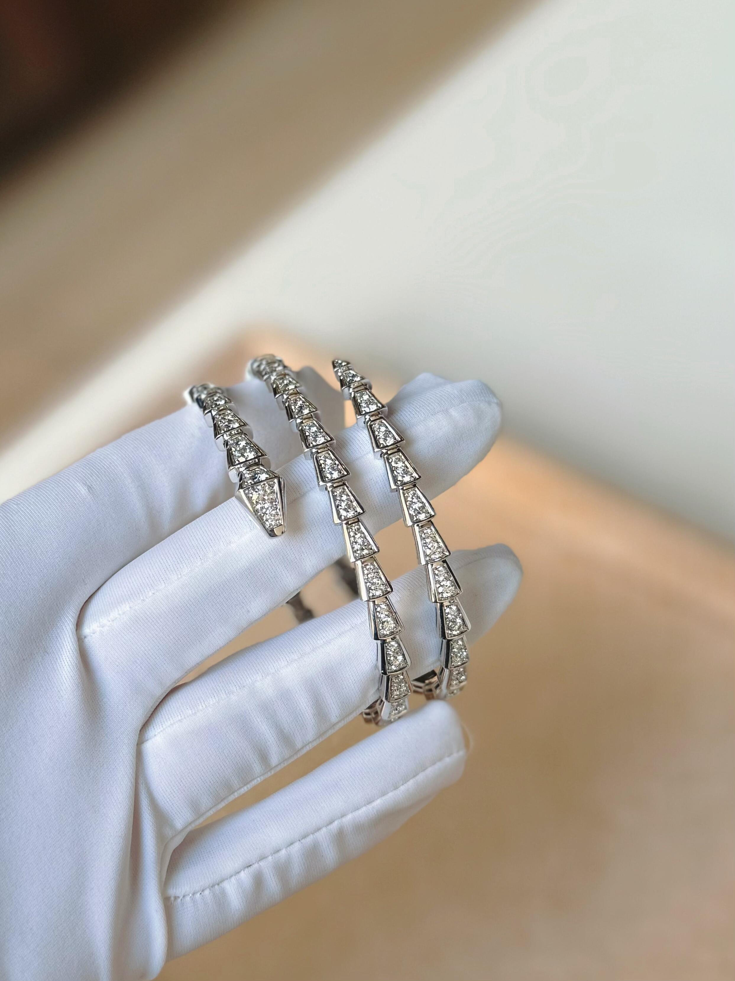 تقديراً للثعبان الذي يمثل روحها، قامت بولغري بغرس قوة الإغواء في سوار سيربنتي فايبر المفعم بالجاذبية في تصميمه الآسر. تلتف قطعة المجوهرات الأنيقة حول المعصم لتتألق بجمال الحراشف الفاخر وبانسيابية الثعبان المتميزة.