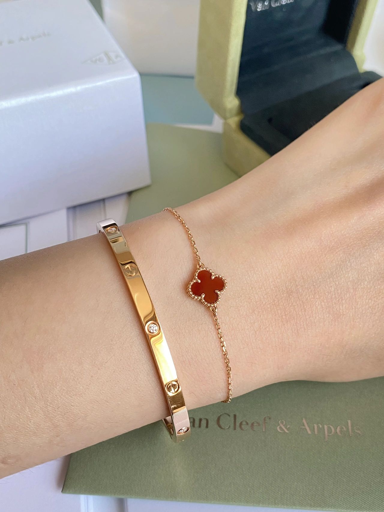 سوار من مجموعة LOVE، موديل الحجم الصغير، مصنوع من الذهب الأصفر 750/1000، ومرصّع بـ 6 ماسات تزن معًا 0.15 قيراط. يُباع مع مفك براغي. العرض 3.65 مم، السماكة 2.05 مم (للمقاس 17). تواصل كارتييه قصة سوار LOVE مع نسخة أرفع حيث حافظت على نفس التصميم ونفس الشكل البيضاوي لتروي نفس قصة هذا الإبداع العابر للزمن ولكن بنسخة رفيعة تثبَّت بواسطة مفك براغي. يتكوّن نظام الإغلاق من برغي عملي على جهة من السوار ومن مفصل على الجهة